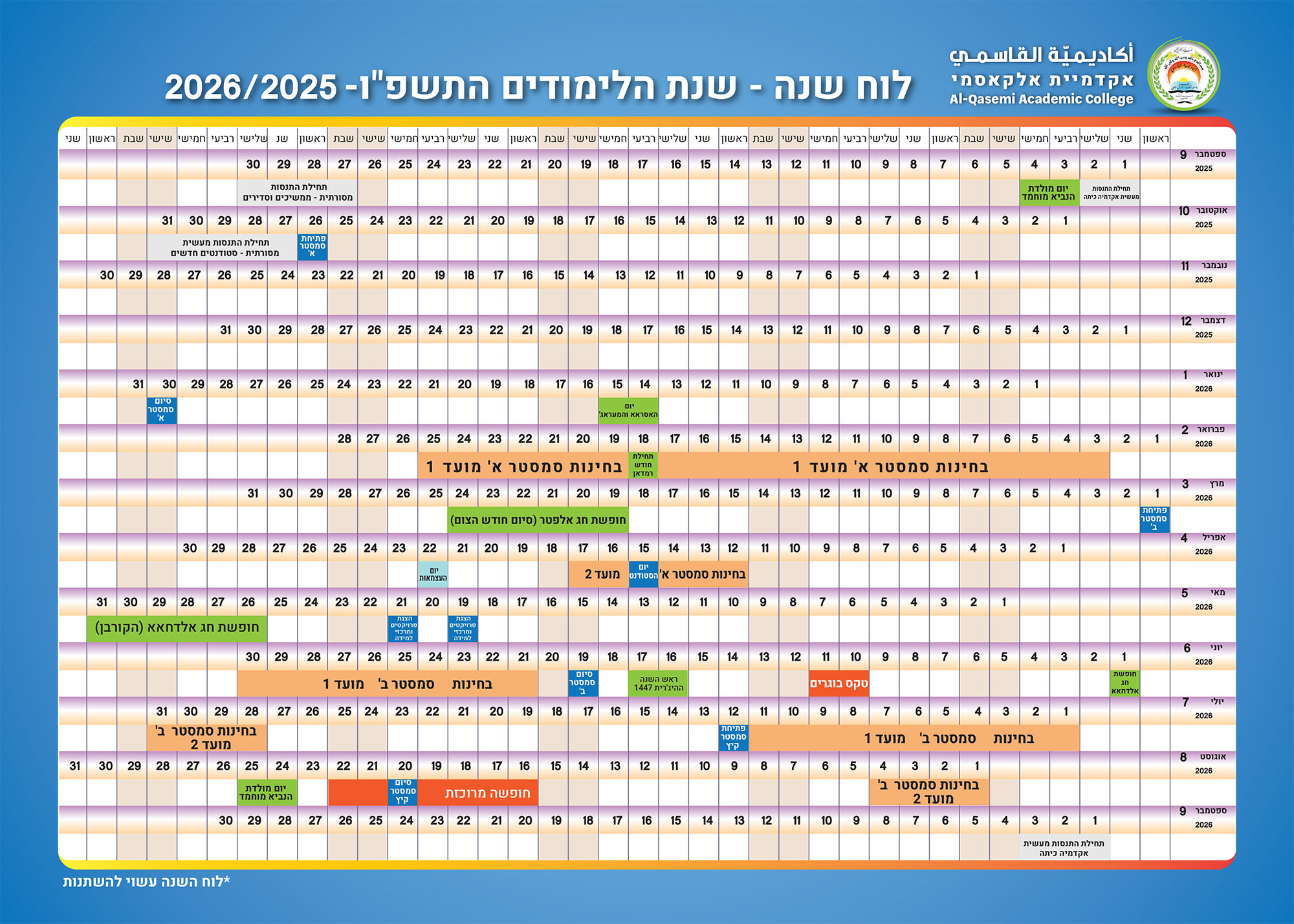 לצפייה בלוח השנה האקדמית 2025/2026 בפורמט PDF, לחץ על קישור זה